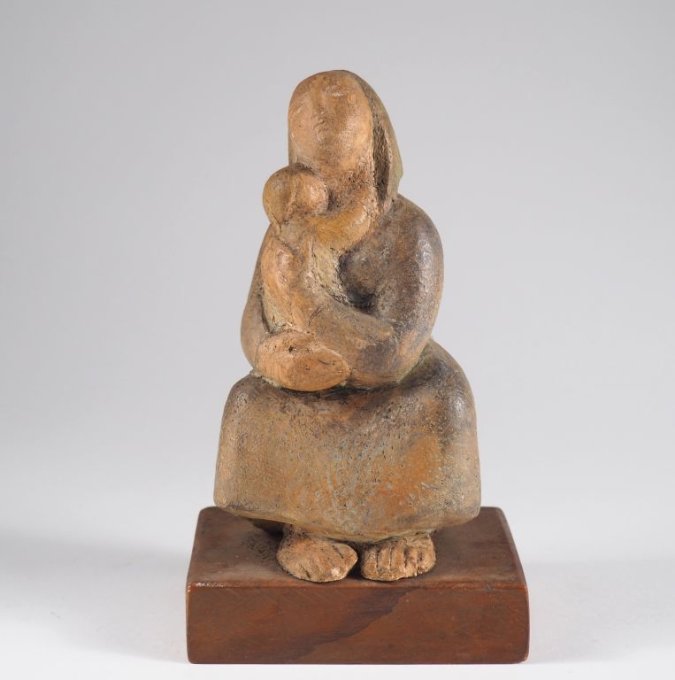 Henri Paul REY. "jeune mère et son enfant" Sculpture en terre cuite émaillée polychrome Signée H. 14 cm
