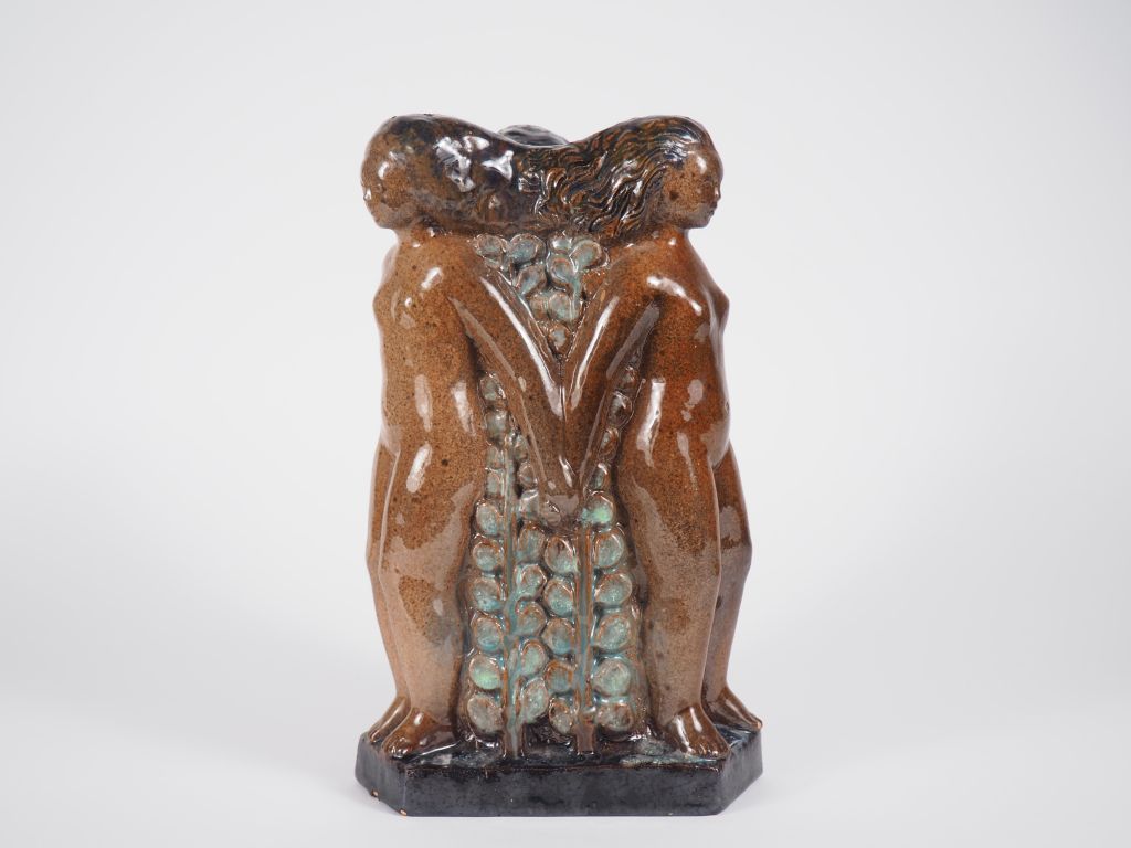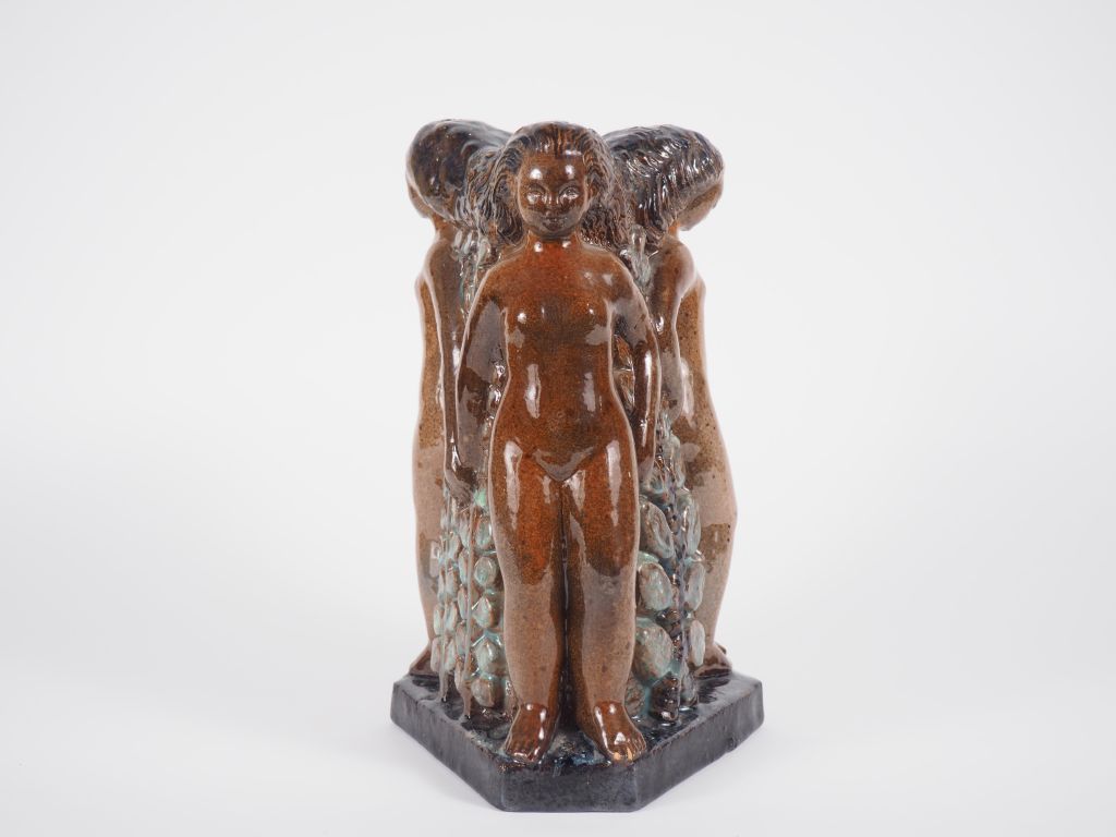 Henri Paul REY. "les trois grâces" Groupe en terre cuite vernissée polychrome Signé (micro égrenure) H. 30 cm