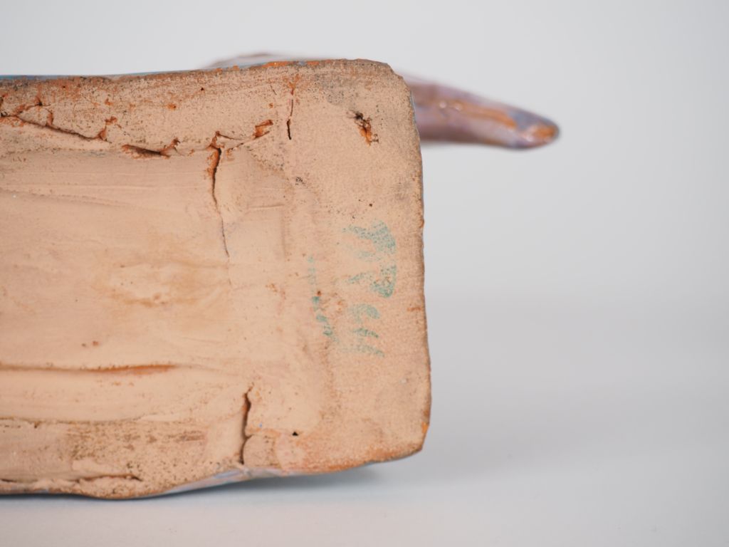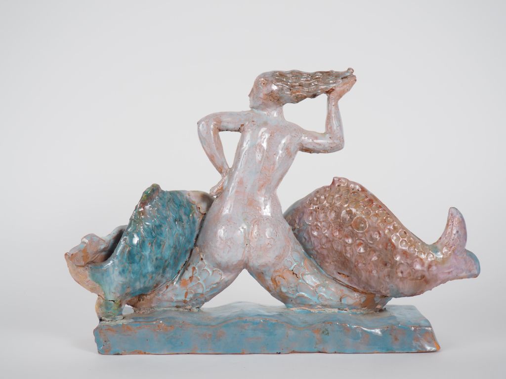 Henri Paul REY. "Sirène et deux poissons" Groupe en terre cuite vernissée polychrome Signé Dim. 24 x 28,5 x 7 cm (petits accidents, et restaurations)