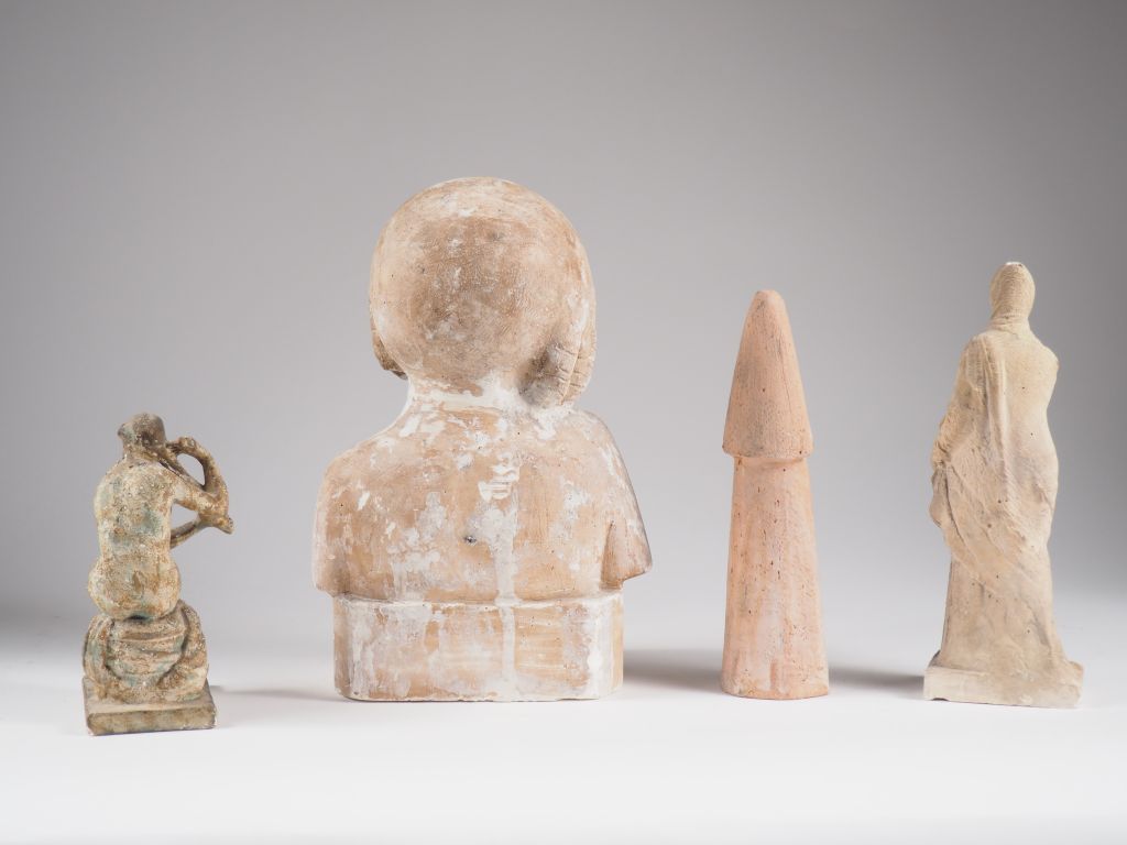 Henri Paul REY. "tanagra" Sujet en platre H. 21,5 cm On y joint un sujet en platre "jeune femme à la tresse" H. 15 cm et "portrait de fillette en buste" H. 26,5 cm Sujet en terre cuite "vierge à l'enfant" H.20,5 cm