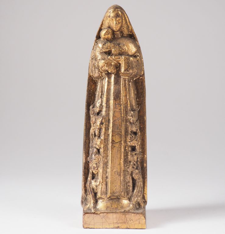 Henri Paul REY. "Vierge à l'enfant" Sculpture en terre cuite émaillée et dorée H. 22 cm