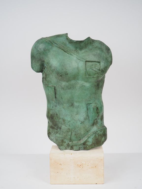 Igor MITORAJ "Persée" Sculpture en bronze à patine verte. Socle en travertin blanc. Signée. Numérotée B854/1000 HC. H. sans le socle. 38 cm H. avec le socle. 48 cm
