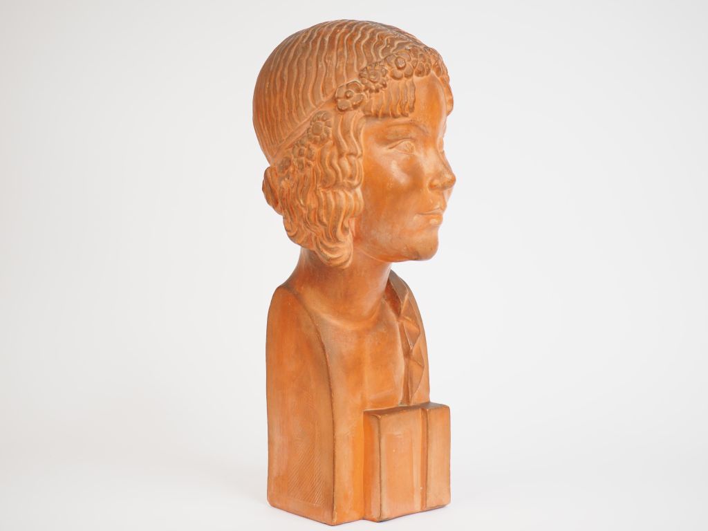 LOUREL. 'Jeune fille à la couronne de fleurs'. Sculpture en terre cuite, signée et datée 1949. H. : 40 cm.