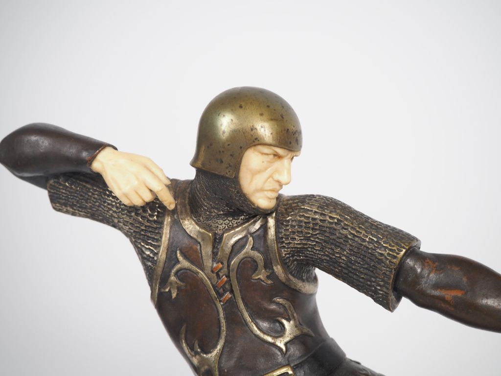 P. LE FAGUAYS. "Archer médiéval" Sculpture chryséléphantine. Signée. Dim. 40 x 39 x 9 cm. Poids. 9,25 kg. Certificat CITES (légère usure du pas de vis)