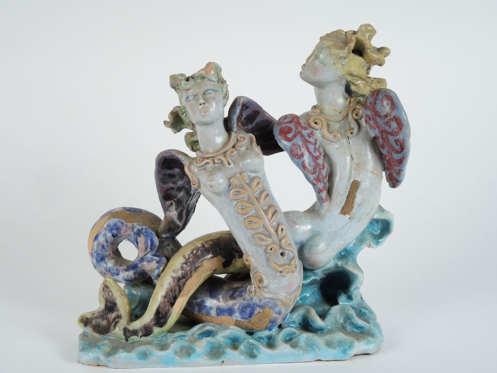 R. BUTHAUD. Groupe en céramique polychrome "Les deux sirènes". Monogrammé sur la terrasse. H. 24 cm (cassées et collées)