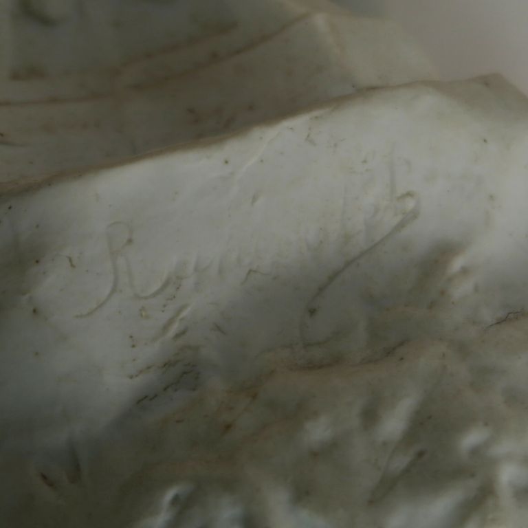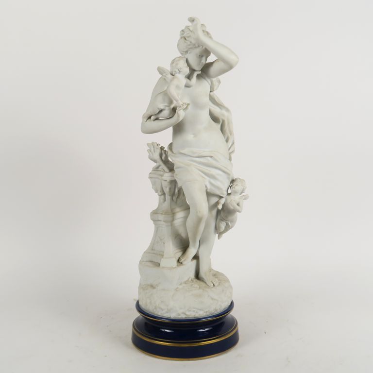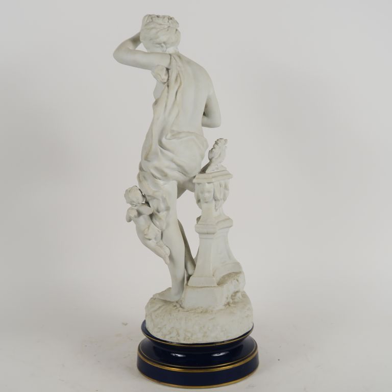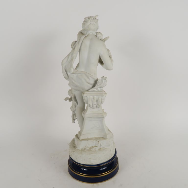 RANCOULET. "la marchande d'amour" Grand biscuit Signé H. 57,5 cm sur un contre socle en bleu de four orné de liserés dorés. H. du socle 8 cm
