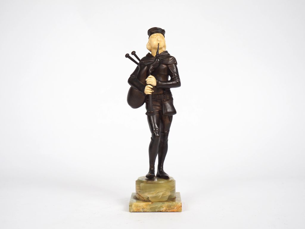 RIVET. "Joueur de Cornemuse". Sculpture chryséléphantine sur un socle en onyx. Signée. H. : 24 cm.