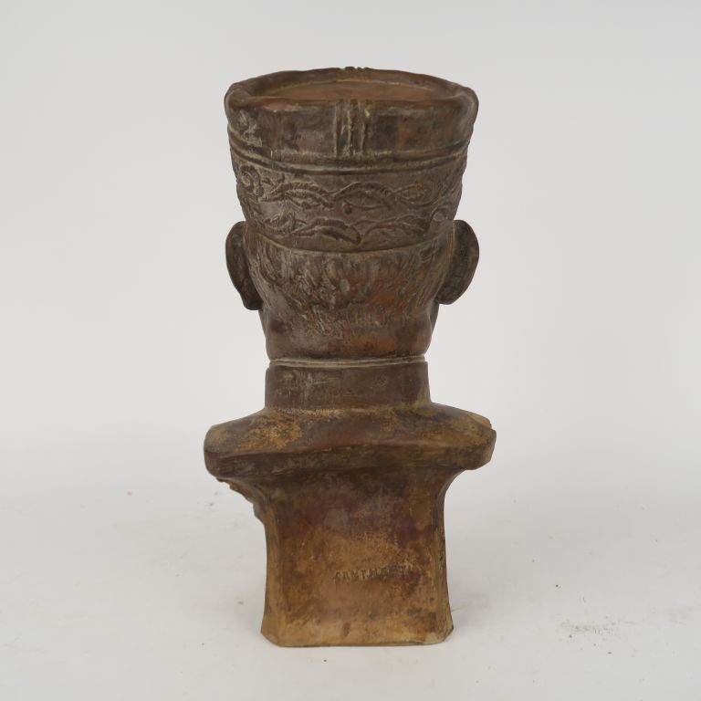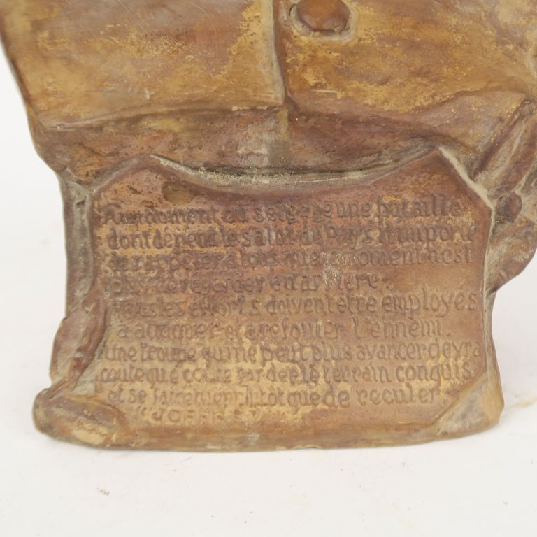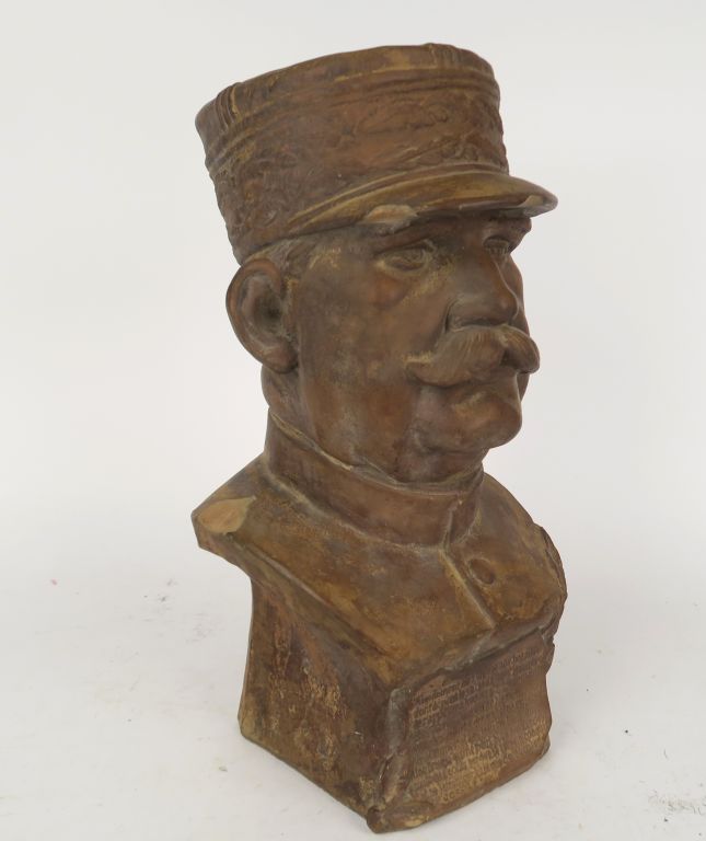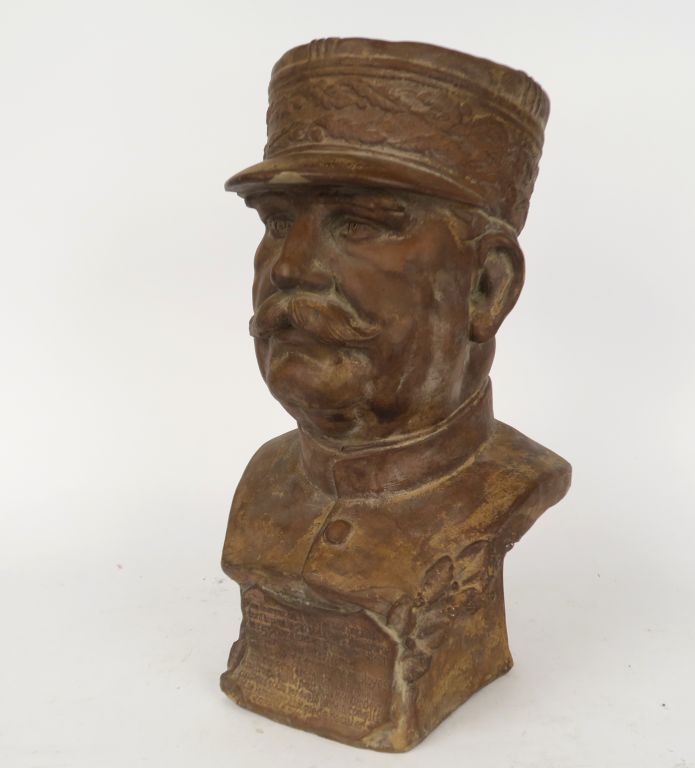 SANT MARTI."Le Maréchal JOFFRE". Buste en terre cuite ( éclats à la visière du képi et à l’épaule), avec à la base, la retranscription de l’ordre du jour de la Bataille de la Marne. H. : 44 cm. A.B.E.