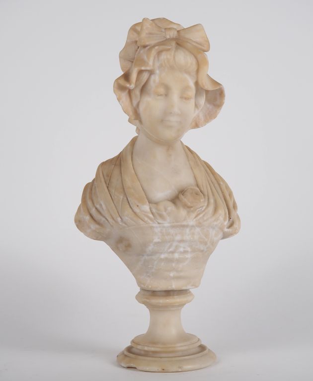 Sculpture 1900 en albatre "portrait de jeune fille en buste" H. 33,5 cm (petites égrenures)