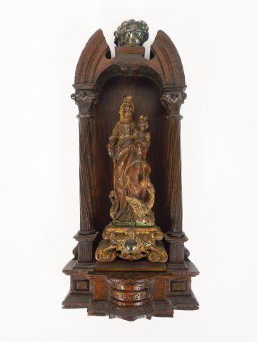 Sculpture XVIIème en bois polychrome dans une niche de style gothique en chêne sculpté, marquée 1632. Petite ornementation en métal H. 30 cm