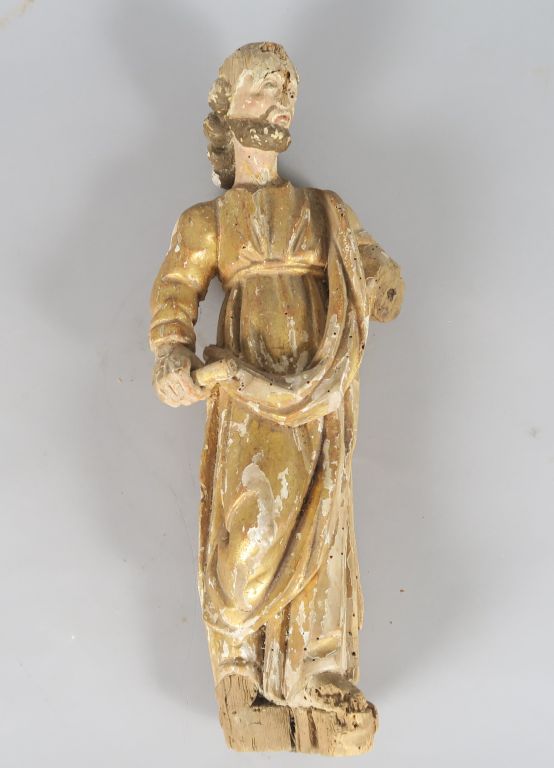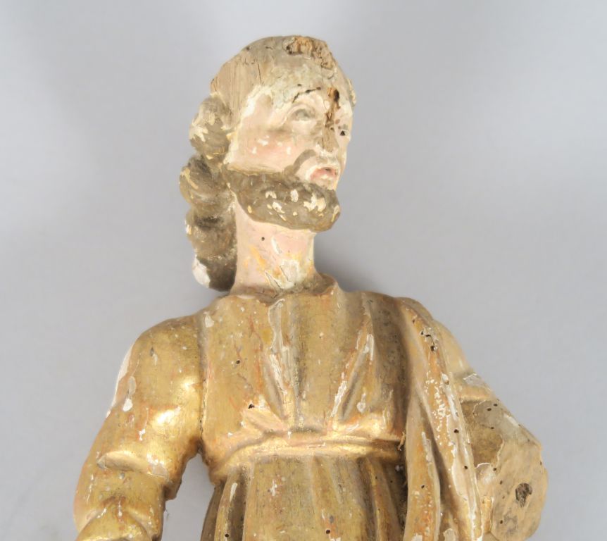 Sujet XVIIIème en bois sculpté, doré et polychrome "Saint personnage" H. 36,5 cm (manques et accidents)