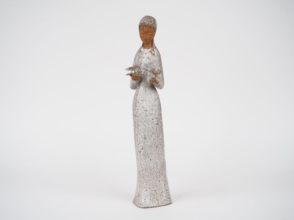 Sujet XXème en grès "jeune fille aux deux colombes". H. 37,5 cm