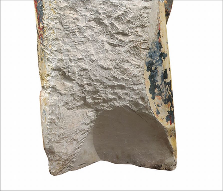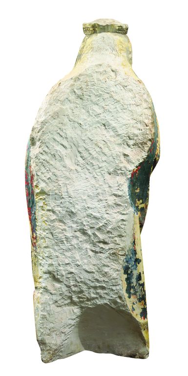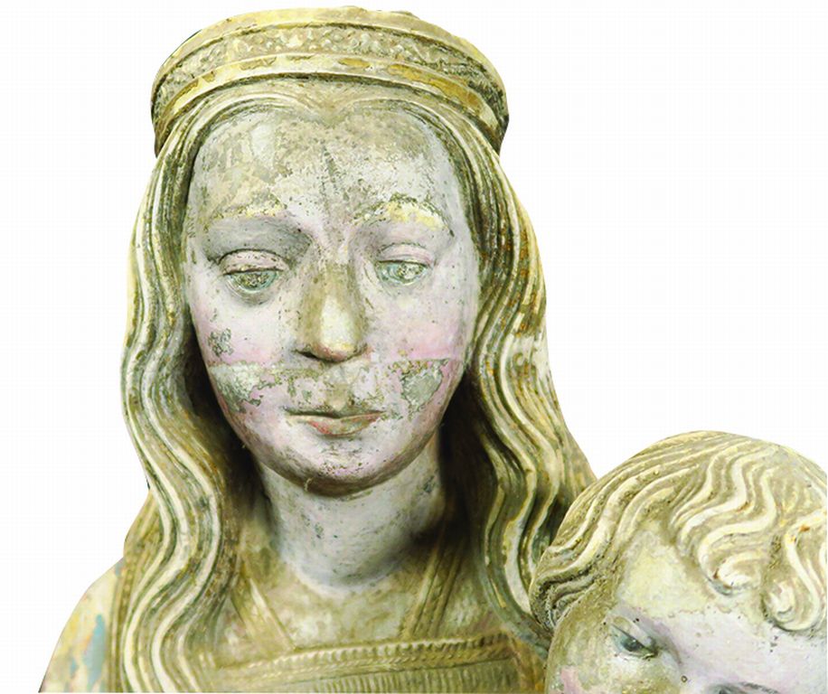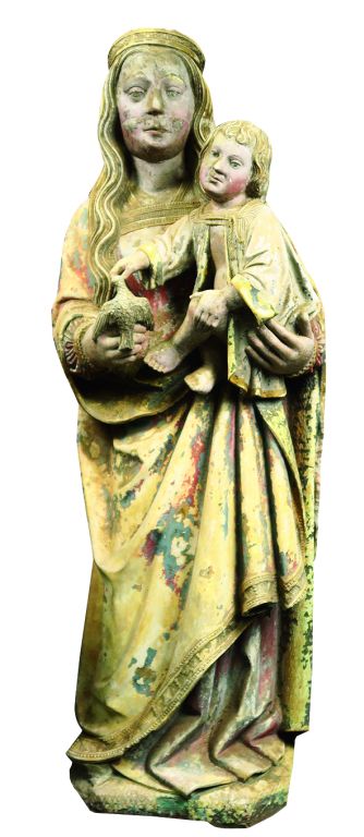 Vierge à l’Enfant en pierre sculptée et polychromée. Debout, elle porte l’Enfant sur son côté gauche , tête ceinte d’une couronne posée sur une chevelure aux mèches ondulées tombant sur les épaules , elle est vêtue d’une robe à l’encolure droite et d’un manteau aux bords brocardés et perlés dont un pan revient sur le devant en formant des plis étagés en V sur le côté gauche , elle présente de sa main droite un oiseau à l’Enfant qui saisit le bec de ses doigts , l’Enfant porte un manteau retenu sur le haut de sa poitrine par une cordelette. Champagne ?, vers 1480 H. 128 cm (une ligne horizontale régulière marque le tour de la tête de la Vierge sans que l'on puisse déterminer précisément s'il s'agit d'une trace de scie, très légers accidents) Expert : Laurence Fligny