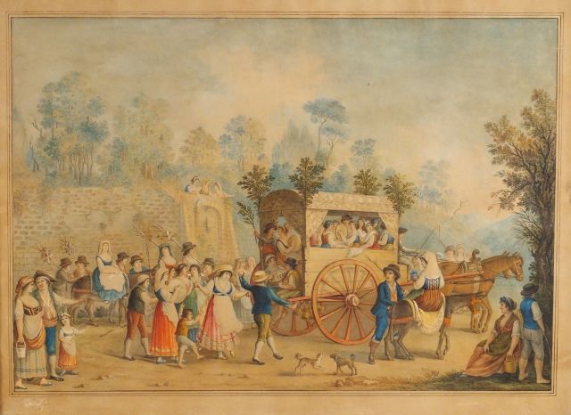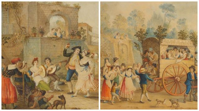 ALESSANDRO D'ANNA, "Scène de danse" et "Cortège joyeux". Aquarelles. Une signée. 55,4 x 38,4 cm