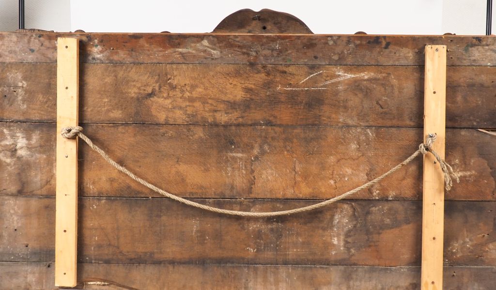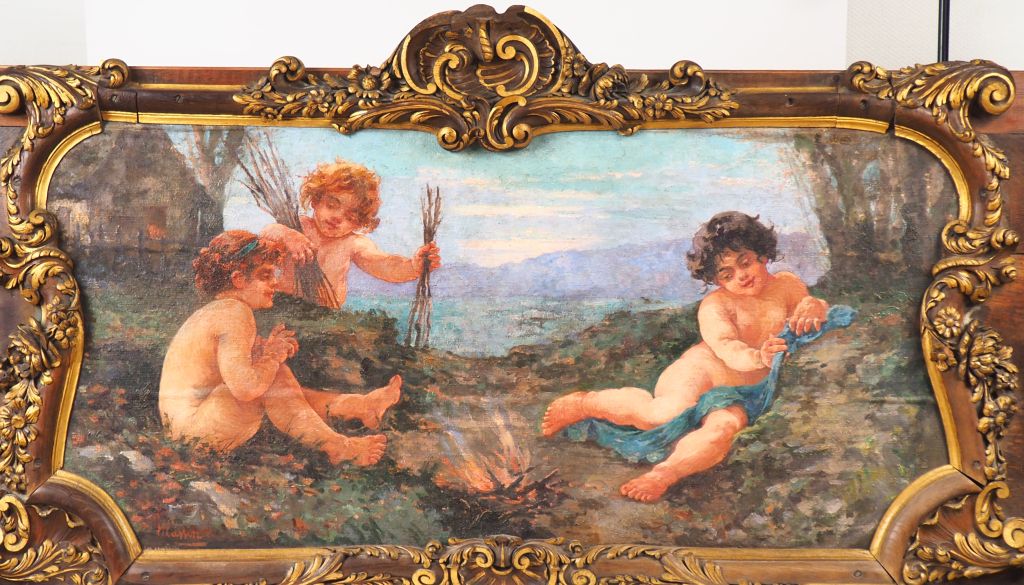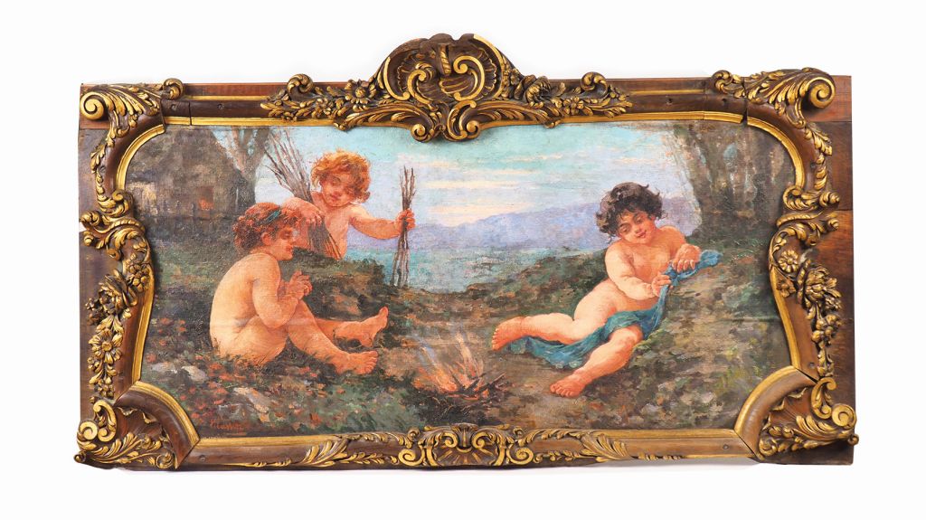 Alexandre Charles MASSON ( école Française vers 1900) "Allégorie de l'hiver" Panneau de chêne renforcé Hauteur : 63 cm Largeur : 137 cm Cadre En chene sculpté partiellement doré à décor de rocaille Signé en bas à gauche (Dimensions à vue) Expert : Cabinet Turquin - Stéphane Pinta