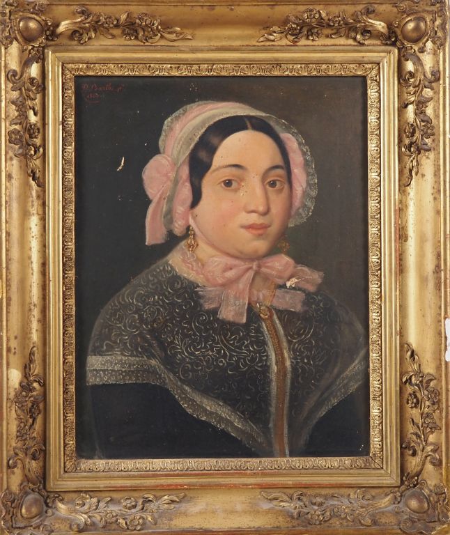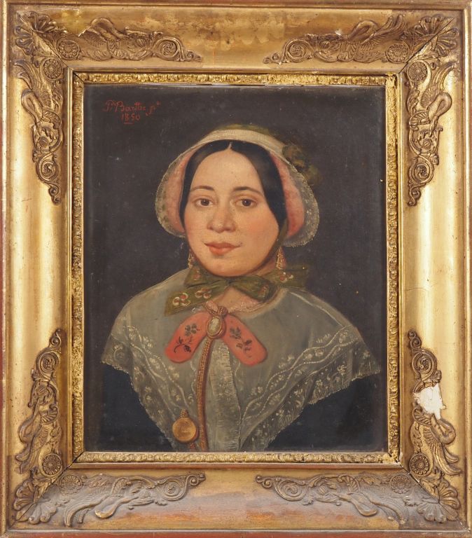 BARTHE. "portraits de jeune fille" Paire d'huiles sur papier, dans leur cadre d'origine en bois et stuc doré Datées 1850, signées en haut à gauche Dim. À vue : 34 x 26 cm (accidents) Dim. À vue : 35 x 29 cm