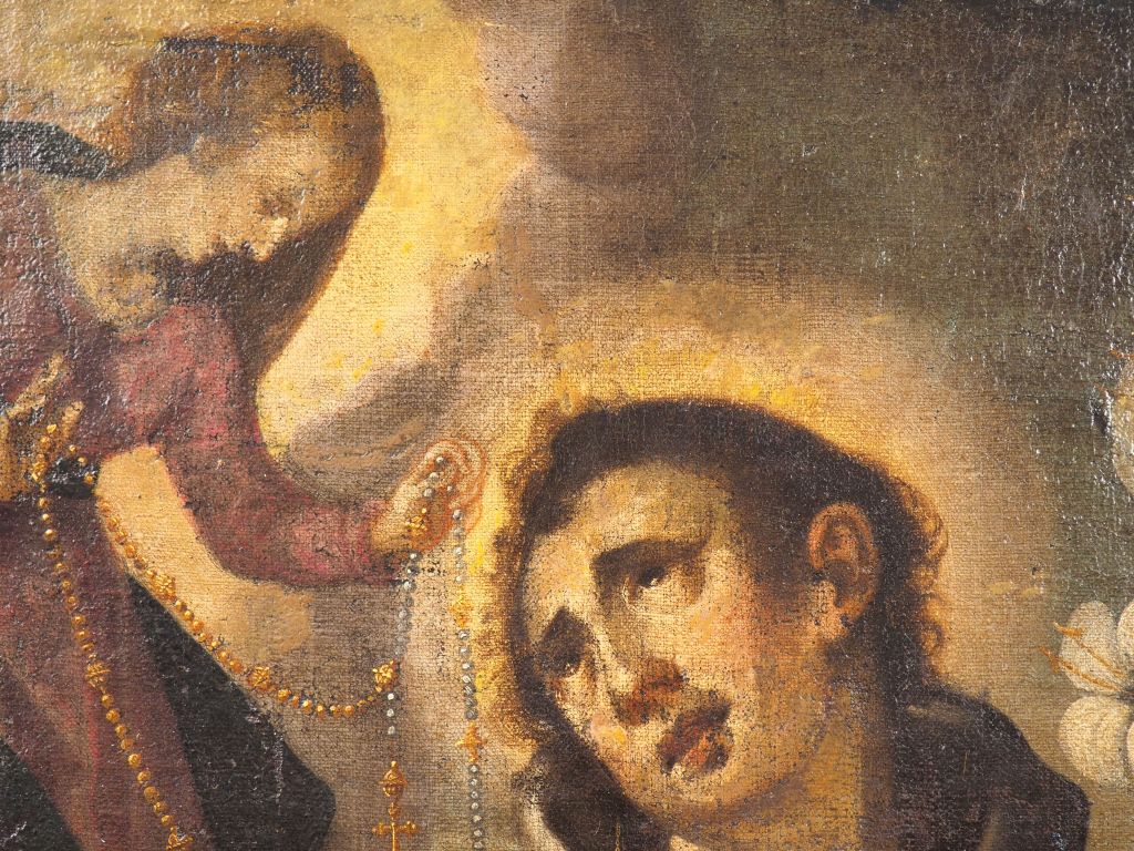 Ecole d'Italie du Nord vers 1620, entourage de Morrazzone. "Saint Dominique recevant le rosaire de la Vierge" Toile marouflée sur panneau Hauteur : 54 cm Largeur : 37,5 cm Restaurations anciennes Expert : Cabinet Turquin - Stéphane Pinta.
