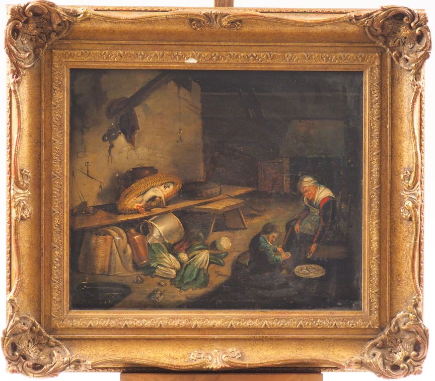 Ecole du nord début XIXème. "Ouverture des huitres dans l'arrière-cuisine". Huile sur toile. Dim. 40 x 48 cm. (Restaurations, réentoilage).