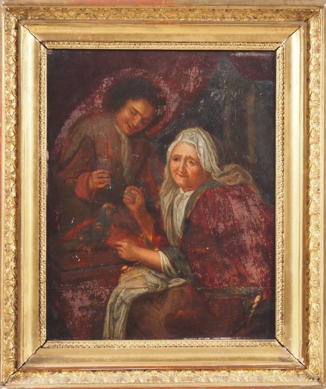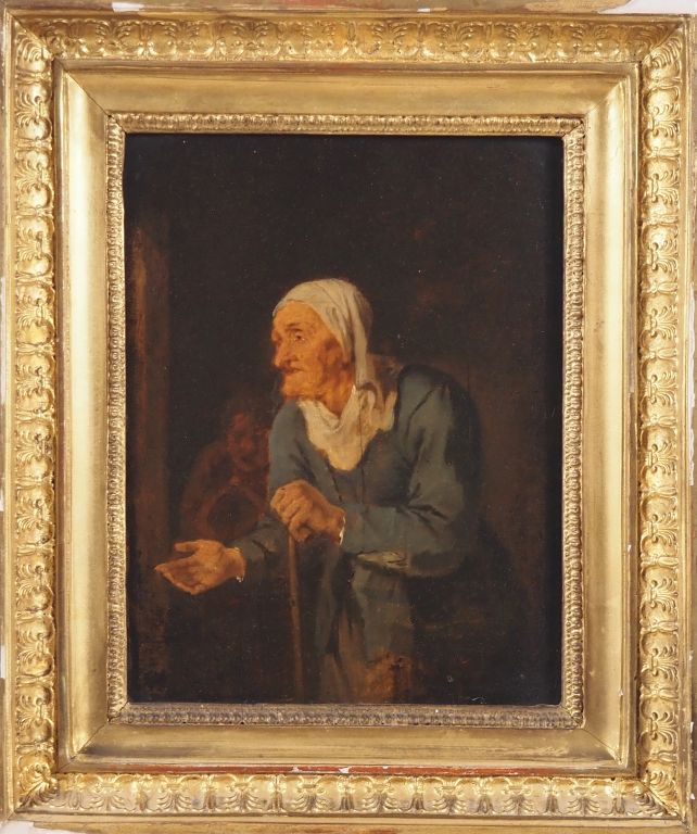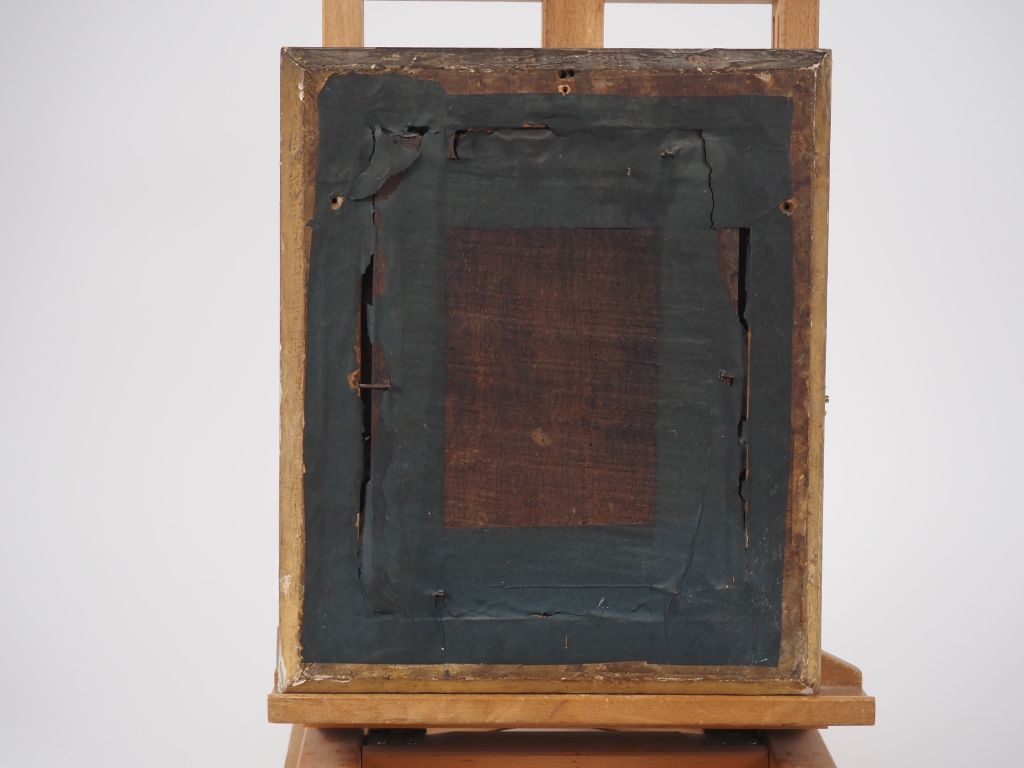 Ecole du Nord XIXème. "personnages" Paire d'huiles sur panneau, dans des cadres d'époque en stuc doré à décor de palmettes Dim. 27 x 22 cm Dim. 25 x 19 cm