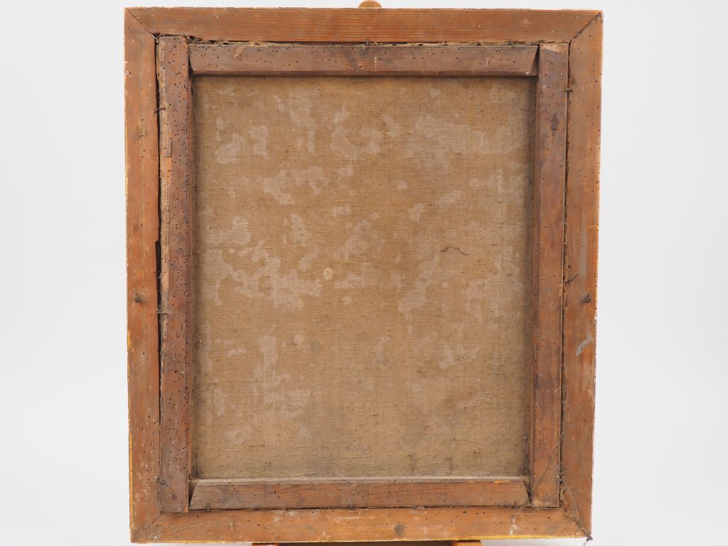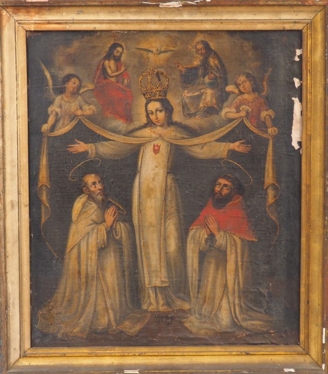 Ecole espagnole XVIIIème. 'Représentation de trois saints personnages et de la sainte Trinité'. Huile sur toile. Dim. : 57 x 50 cm. (accidents)