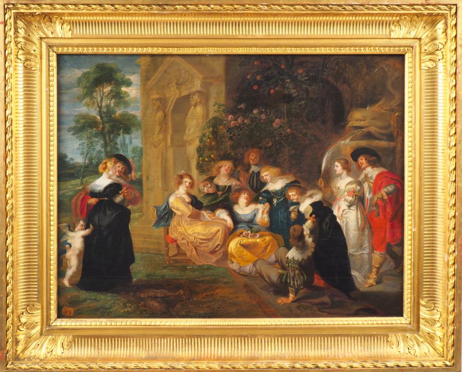 Ecole Flamande du XVIIè, entourage de Pierre Paul Rubens "Le jardin d'amour" Panneau de chene, quatre planches, renforcé Hauteur : 49,5 cm Largeur : 64 cm Au dos du panneau marque de la Guilde d'Anvers Expert : Cabinet Turquin - Stéphane Pinta 01.47.03.48.78