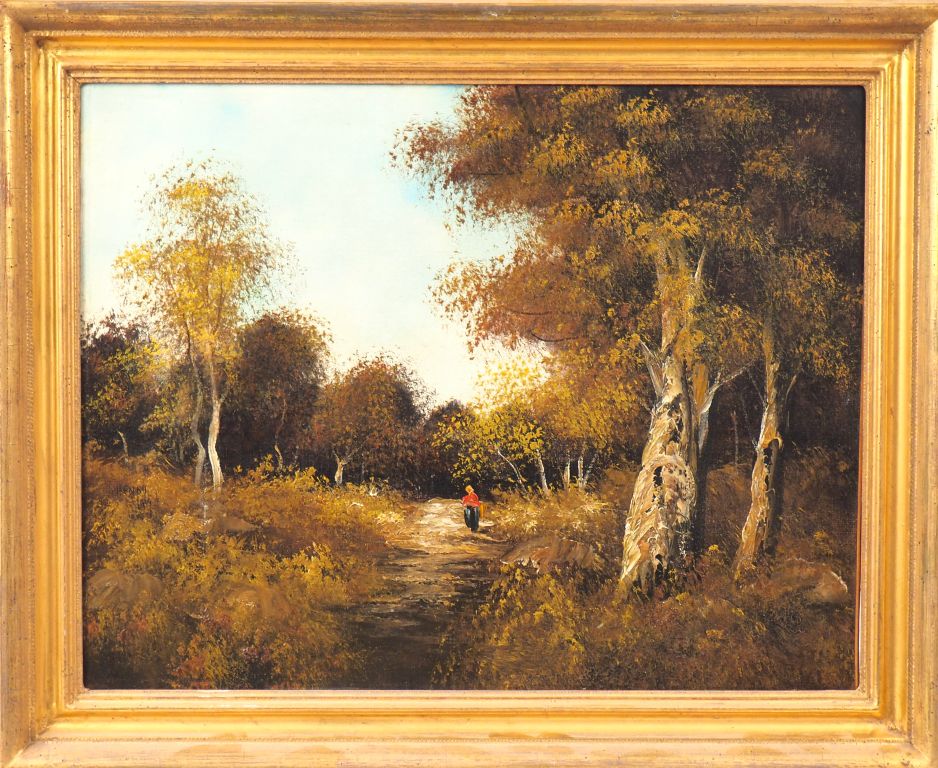 Ecole française 1900. "jeune femme cheminant en lisière de forêt". Huile sur toile Dim. 44 x 54.5 cm (restauré)