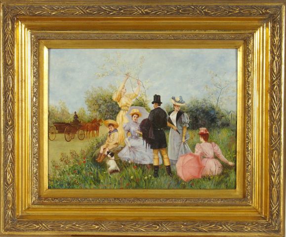 Ecole française 1900 "Un dimanche au parc". Huile sur panneau. 30 x 40...