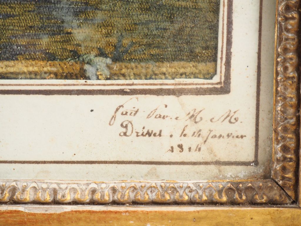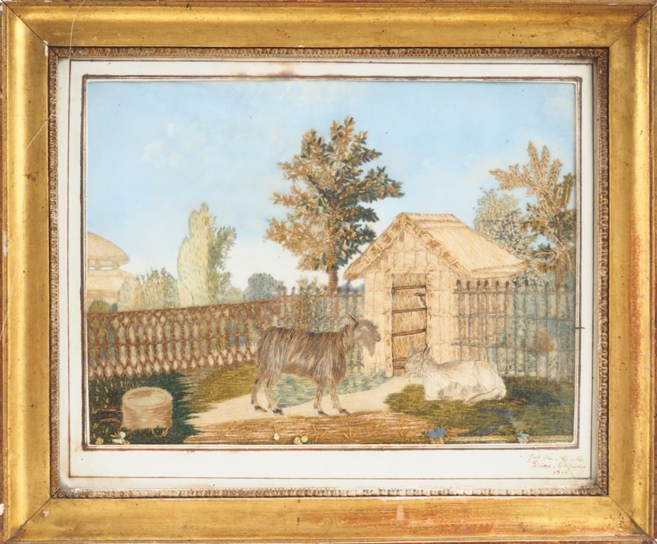 Ecole française début XIXème. "chêvres dans leur enclos". Soie brodée et aquarelle, dédicacée en bas à droite et daté 1814. Dim. à vue: 26 x 35 cm.