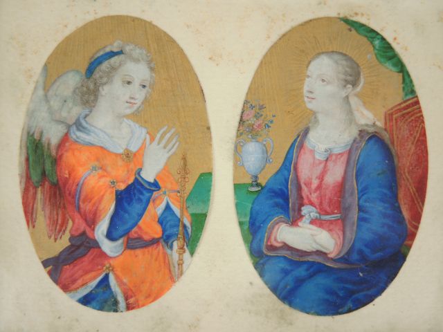 Ecole française début XIXème "L'Annonciation". Paire de gouaches sur papier de forme ovale. Dans un même encadrement. Dimensions des gouaches 7,5 x 4,5.
