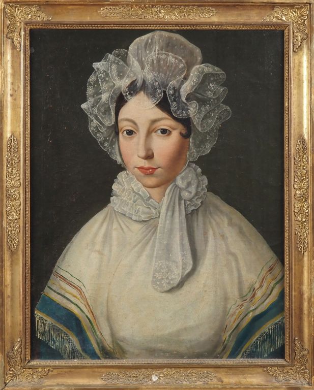 Ecole française début XIXème. "Portrait de jeune fille au châle". Huile sur toile. Dim. 62,5 x 48 cm.