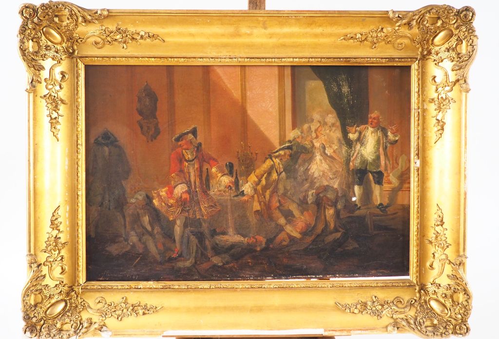 Ecole française. "Fin de diner". Huile sur toile, signée en bas à gauche et datée. Dim. 37 x 59 cm . (accidents)