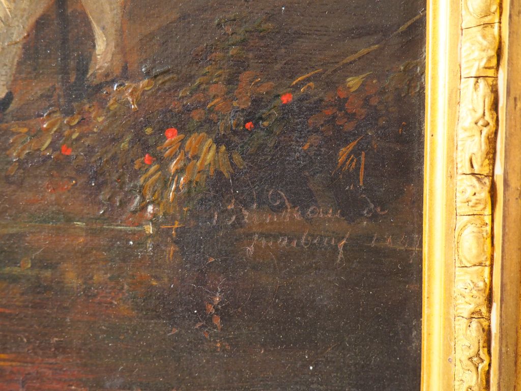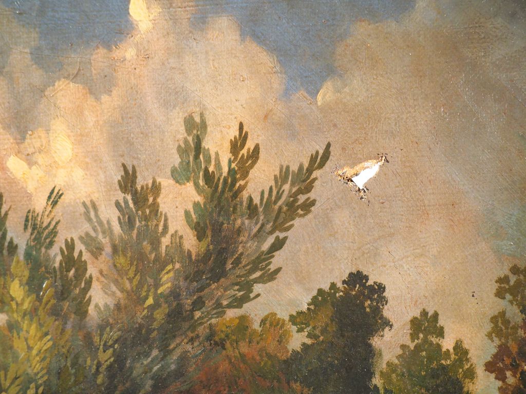 Ecole française fin XIXème. "Conversation galante dans un parc". Huile sur toile. Dim. 53 x 45 cm. (accident)