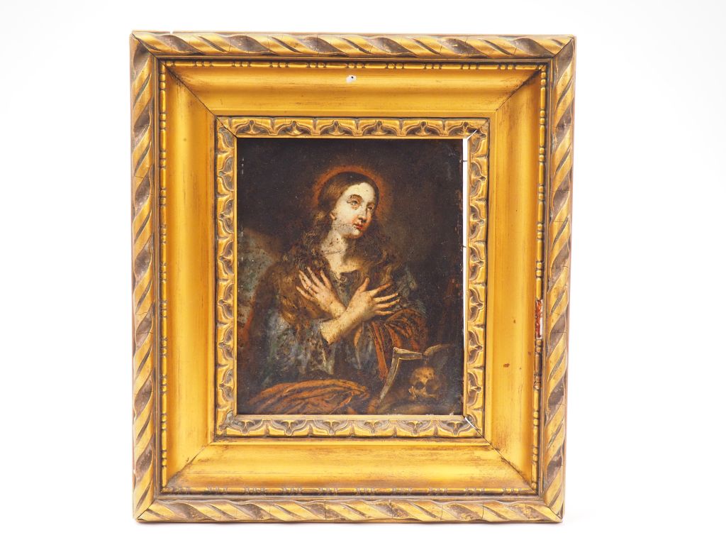 Ecole française fin XVIIe. "Sainte Marie Madeleine". Huile sur cuivre. Dim. : 22,5 x 17 cm (accidents)