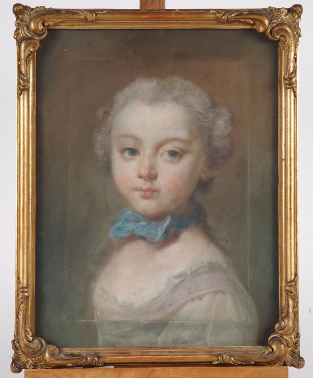 Ecole française fin XVIIIème - début XIXème. "Portrait de jeune fille au nœud de ruban bleu". Dim. 39 x 30 cm. Pastel (Restauration).