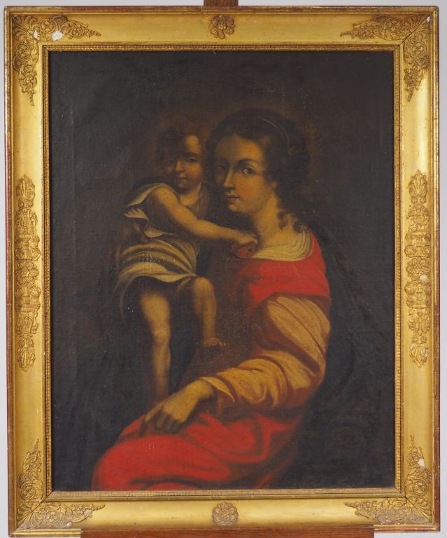 Ecole française fin XVIIIème début XIXème. "Vierge à l'enfant". Huile sur toile dans un cadre Restauration. Dim. : 92 x 72 cm.