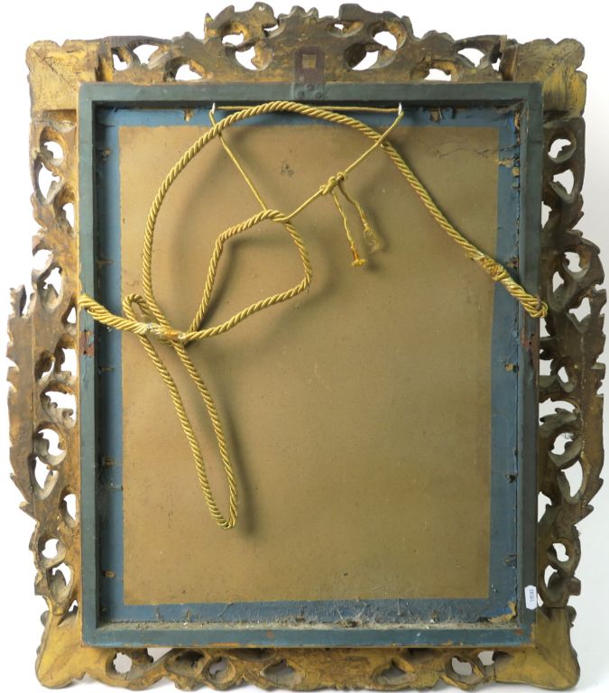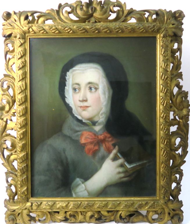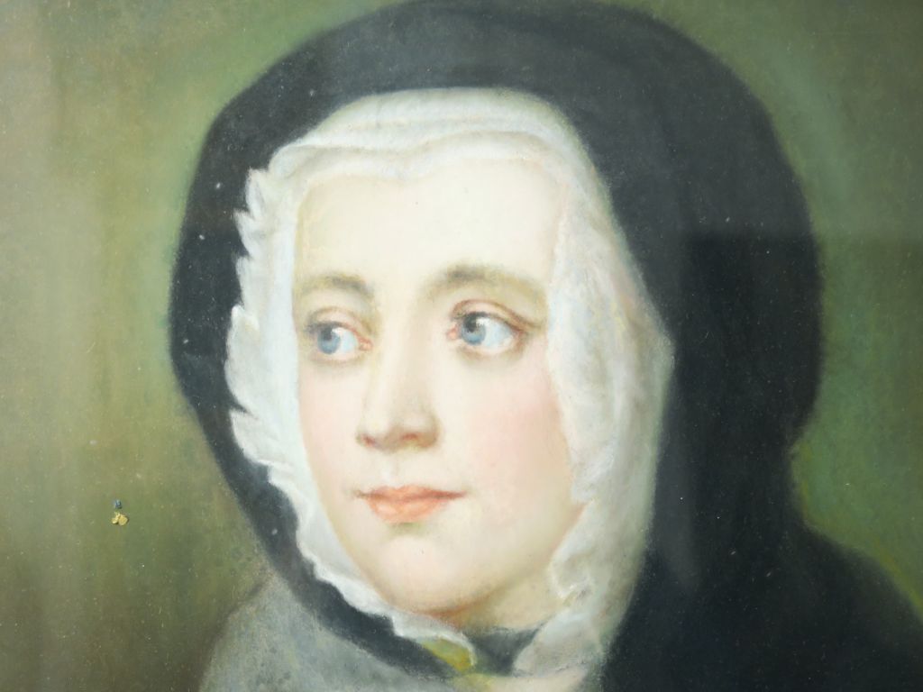 Ecole française fin XVIIIème "Portrait de dame à la coiffe noire" Pastel. Dans son cadre en bois et stuc doré ajouré (petits manques). 46 x 45 cm