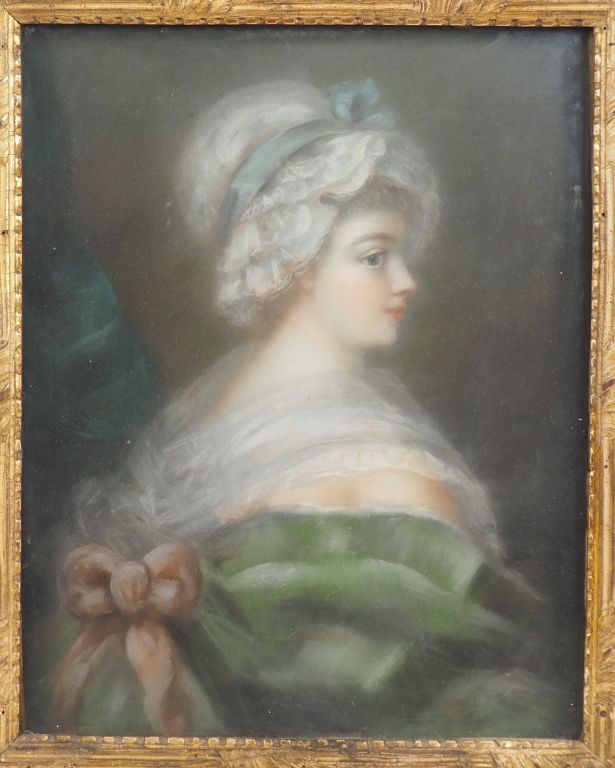 Ecole française fin XVIIIème. "Portrait de jeune femme de profil". Pastel Dim. (à vue) : 41,5 x 33 cm.