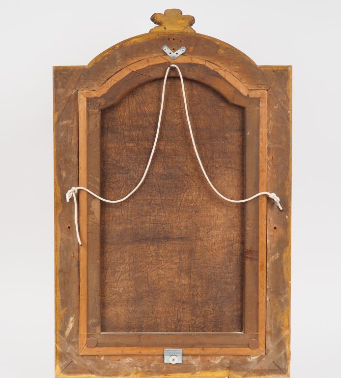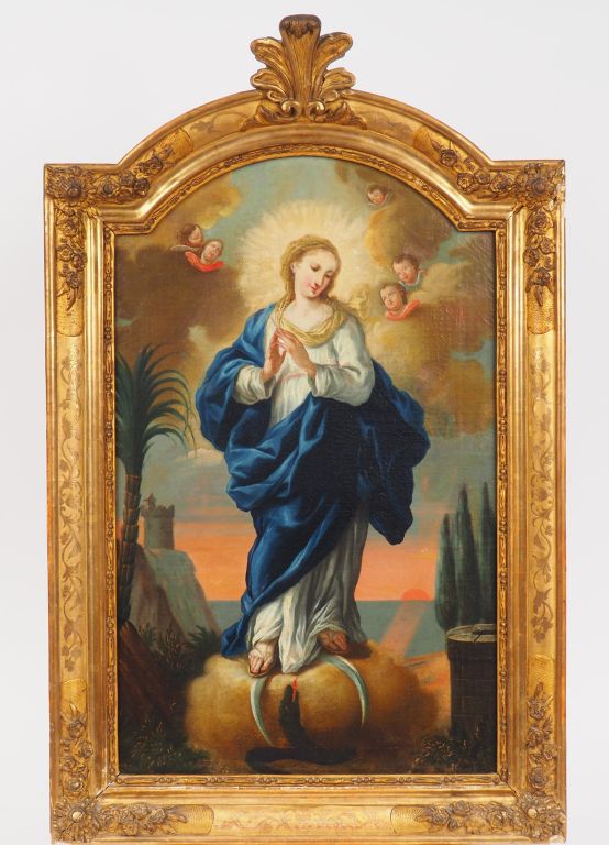 Ecole française ou italienne fin XVIIIème-début XIXème. 'Vierge en majesté'. Huile sur toile. Dim. 56 x 13,5 cm (restauration)