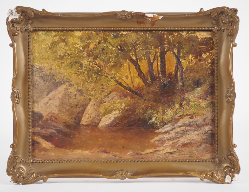 Lot de Ecole française. "sous bois" Huile sur carton, signée en bas à gauche au prix de 50 à 80 € en vente aux enchères par l'hôtel des ventes Primardeco