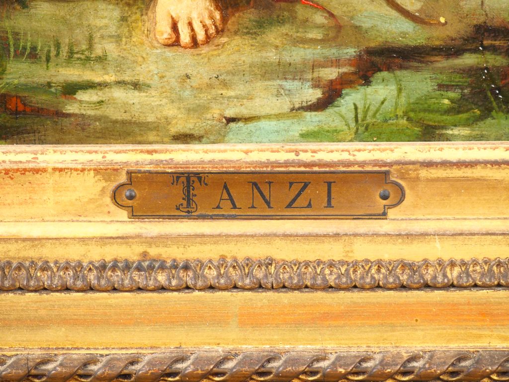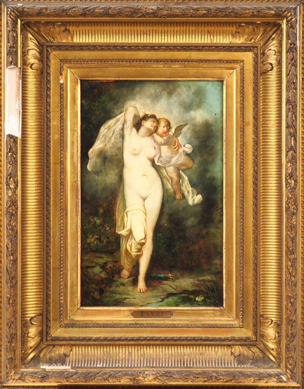Ecole Française vers 1880 "Venus et l'Amour" Panneau Hauteur : 36 cm Largeur : 24 cm Porte une signature Tanzi en bas à gauche, accident au cadre