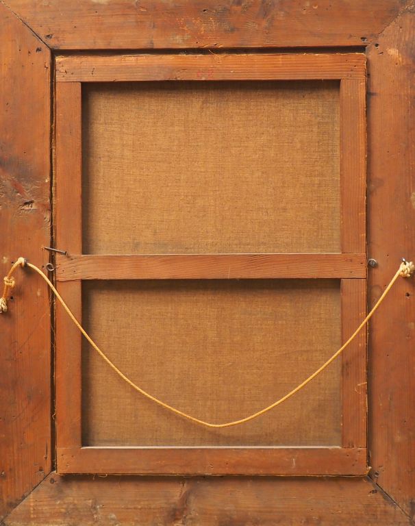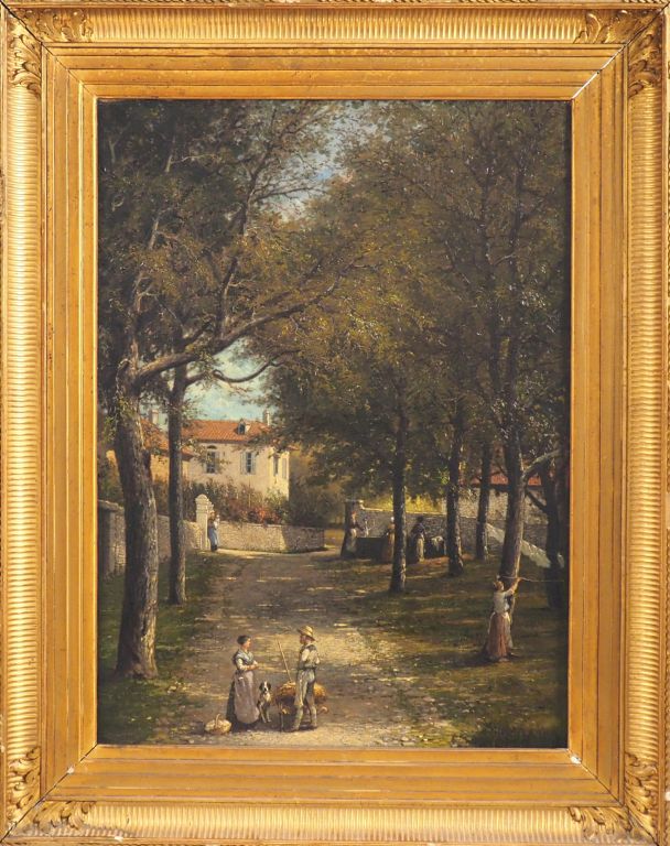 Ecole française XIXème. "Conversation dans l'allée" Huile sur toile, signée en bas à gauche (signature illisible) Dim. 61 x 45,5 cm