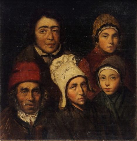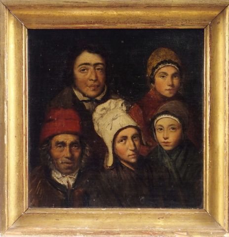 Ecole française XIXème "Etude du 5 visages". Huile sur toile marouflée sur carton. 20,4 x 19,6 cm