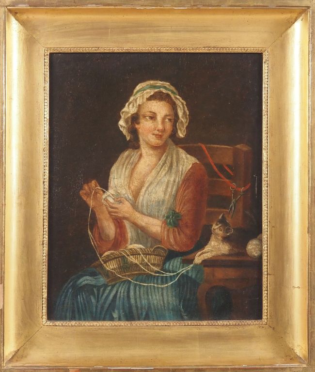Ecole française XIXème. "jeune couturière au chat" Huile sur carton D...