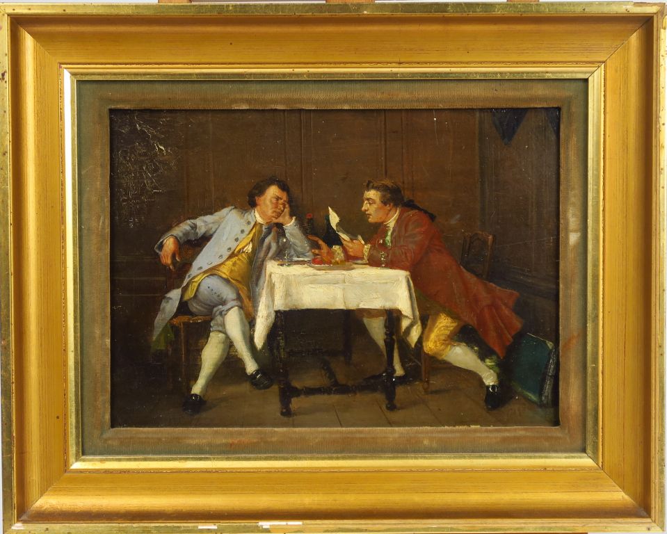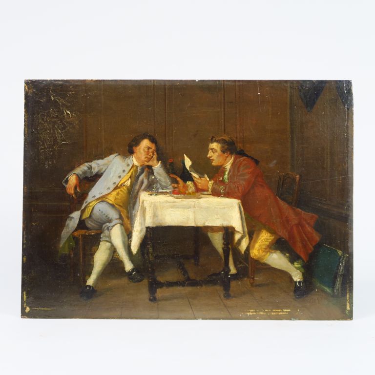 Lot de Ecole française XIXème. "Le déjeuner". Huile sur panneau. Dim. : 24 x au prix de 150 à 200 € en vente aux enchères par l'hôtel des ventes Primardeco