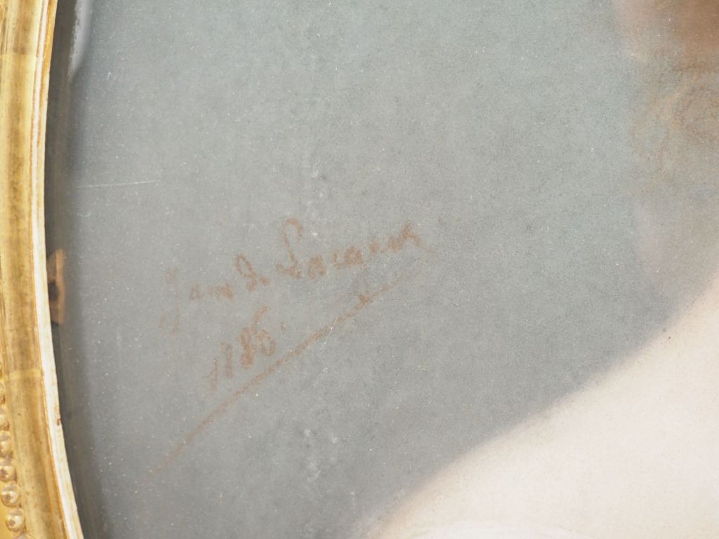 Ecole française XIXème. "Portrait de jeune femme à la robe de soie parme". Pastel sur toile signé et daté au milieu à gauche. Dim. (à vue) : 59 x 49 cm.