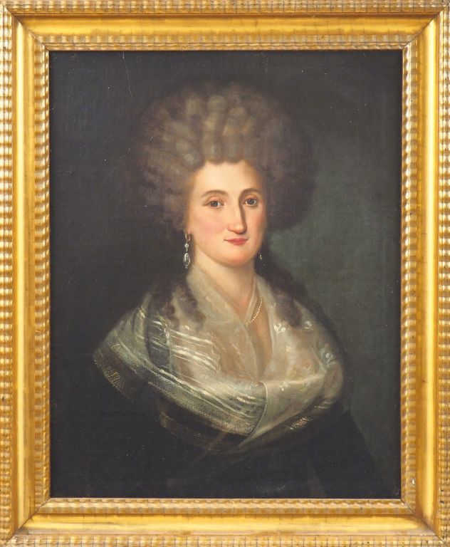 Ecole française XIXème. "Portrait de jeune femme au collier de perles". Huile sur toile Dim. 61 x 47,5 cm. (Réentoilée).