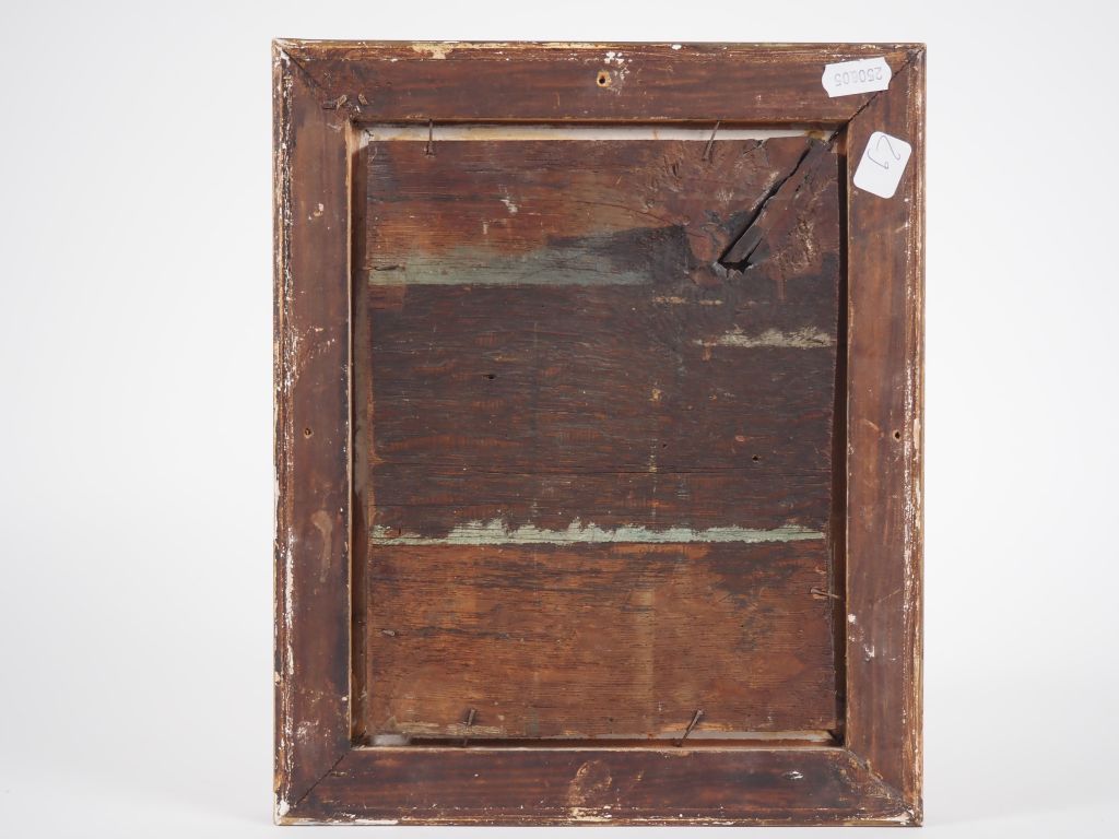 Ecole française XIXème. "Trophée de chasse". Huile sur panneau, signée en bas à droite. Dim. 22,5 x 17,5 cm. (Fente)