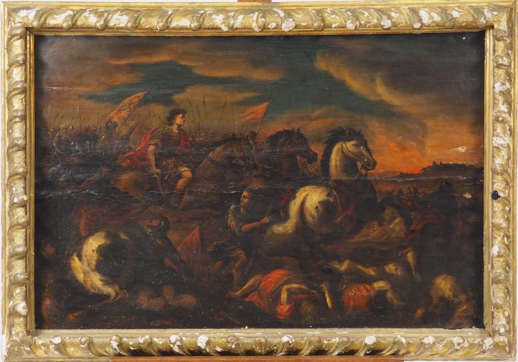 Ecole française XVIIème. "Scène de bataille". Huile sur panneau. Dim. : 60 x 90 cm. (accidents)