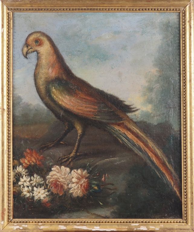 Ecole française XVIIIème. "oiseau et fleur" Huile sur toile (restaurée et réentoilée) Dim. 61 x 50