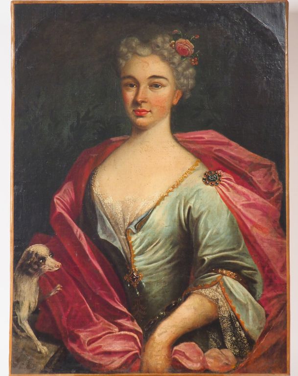 Ecole française XVIIIème. « portrait d’élégante au chien » Huile sur toile Dim. 80 x 59 cm (restauration)